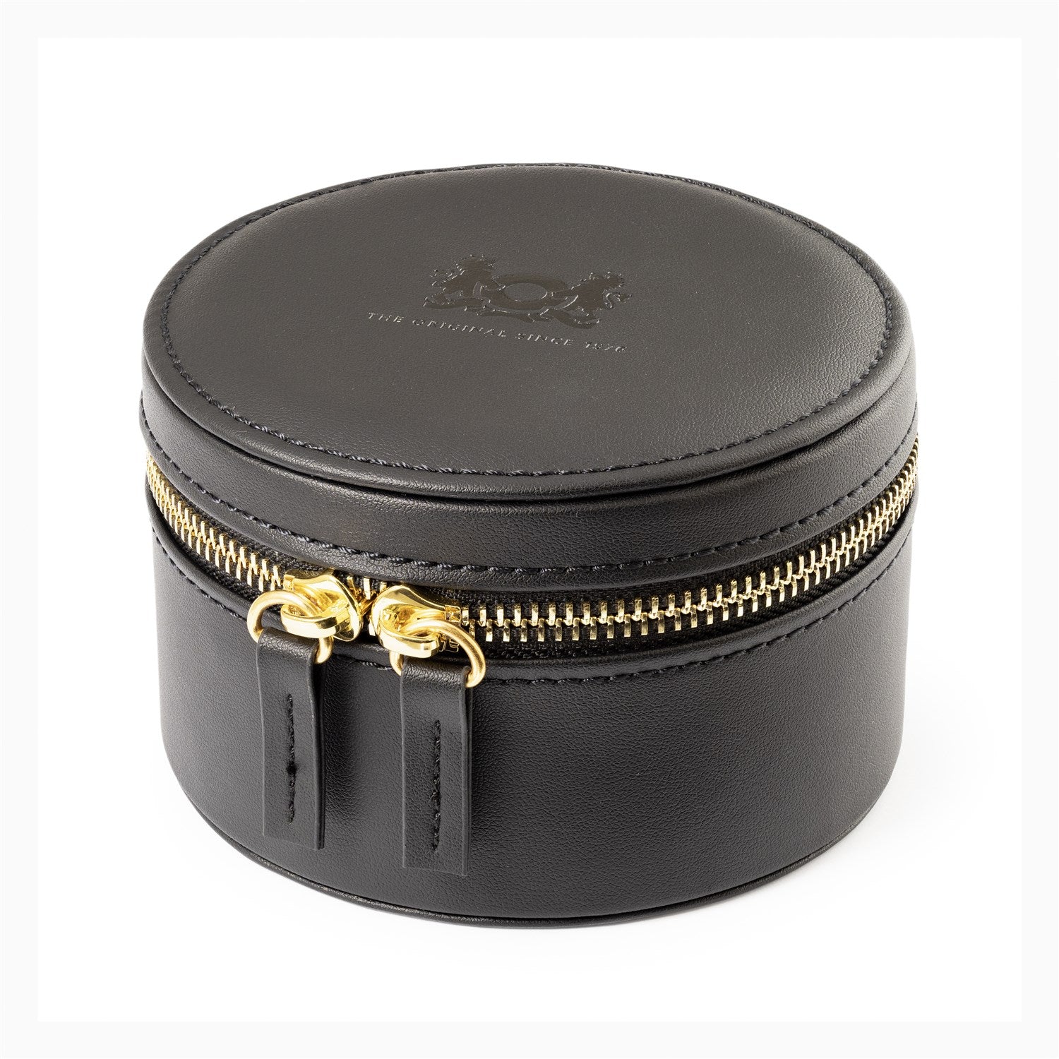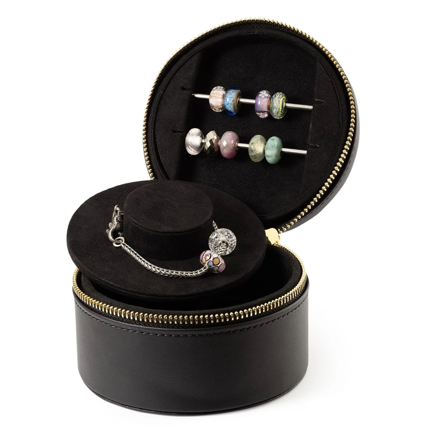 Cette élégante boîte à bijoux ronde a été conçue pour ranger et organiser vos précieux Trollbeads avec style. Elle est recouverte de simili cuir de haute qualité dans un noir raffiné, et dotée d’une fermeture éclair dorée au design élégant.