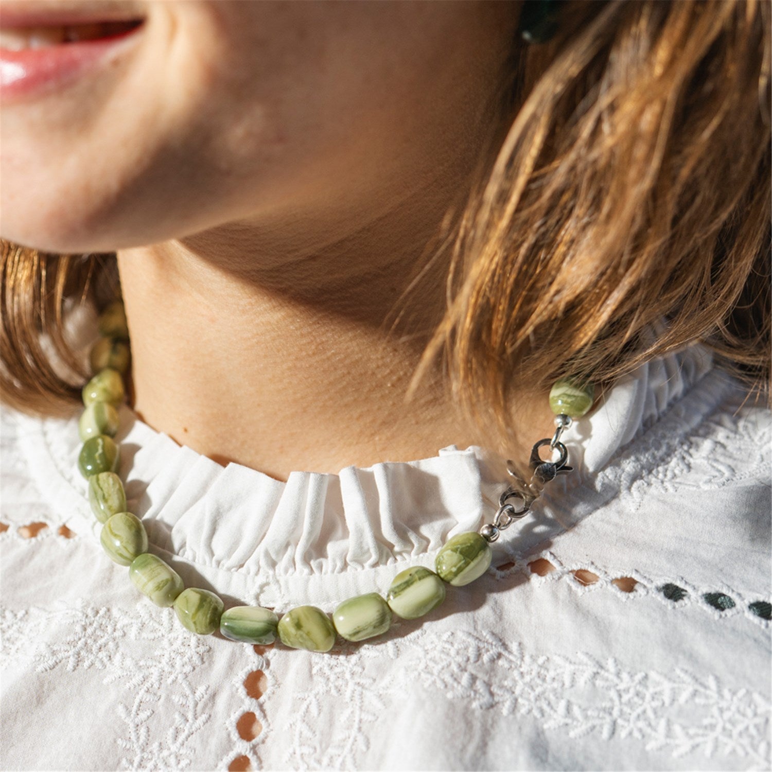 Das Traumhafte Harmonie Collier vereint vierzehn Arten leuchtender, natürlicher Edelsteine zu einem ausdrucksstarken, farbenfrohen und harmonischen Schmuckstück. Dazu gehören: Purple Jade, Amethyst, Peach Moonstone, Citrin, Lapislazuli, Labradorit, Amazonit, Rauchquarz, Dendritenopal, Grauer Mondstein, Weisser Mondstein, Karneol, Lemonquarz und Blue Lace Achat.