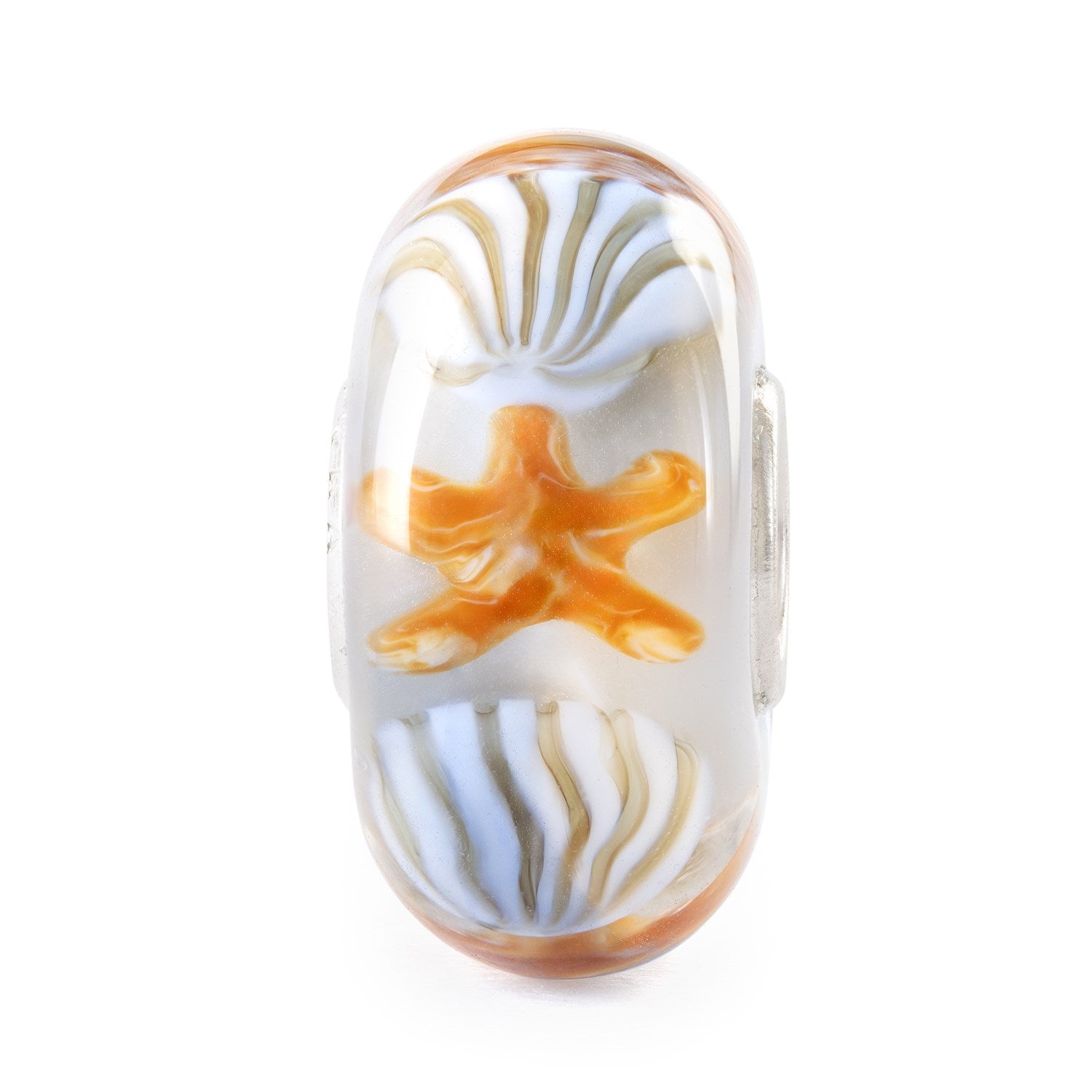 Cette perle de verre présente un aspect bicolore, avec une couche de verre beige plus profonde qui évoque la sensation de sable chaud et doux. La couche extérieure est d'un bleu doux, ornée de coquillages et d'étoiles de mer magnifiquement détaillés - comme une chasse au trésor ensoleillée le long du rivage.
