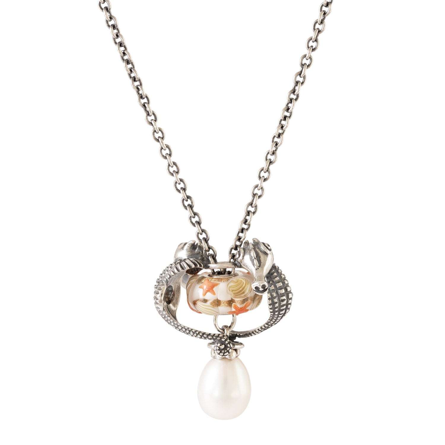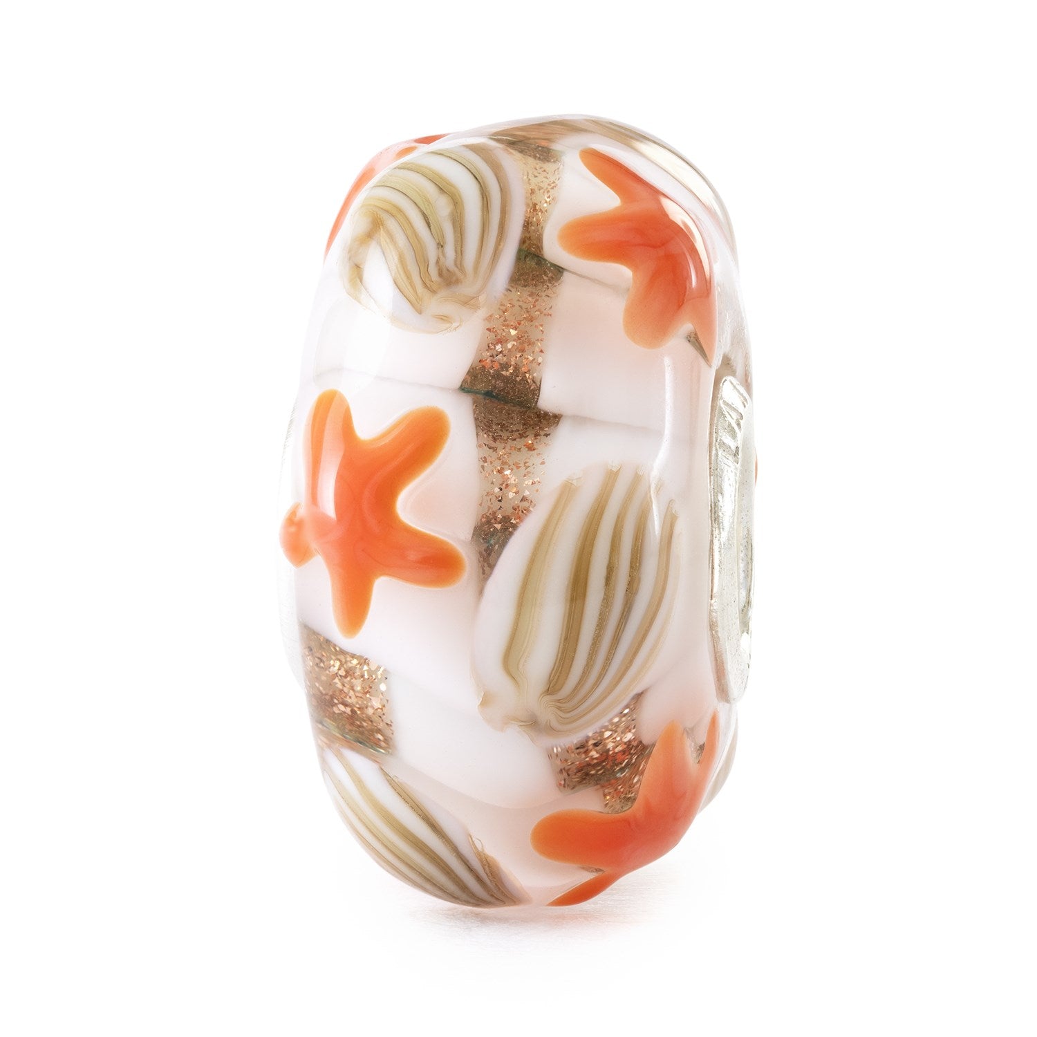 Dans les couches de verre les plus profondes de cette perle, vous trouverez des couleurs douces et des paillettes dorées dans des formes fluides. Dans les couches supérieures, de petites étoiles de mer orange se reposent doucement. Cette perle de verre dansera à la lumière du soleil !