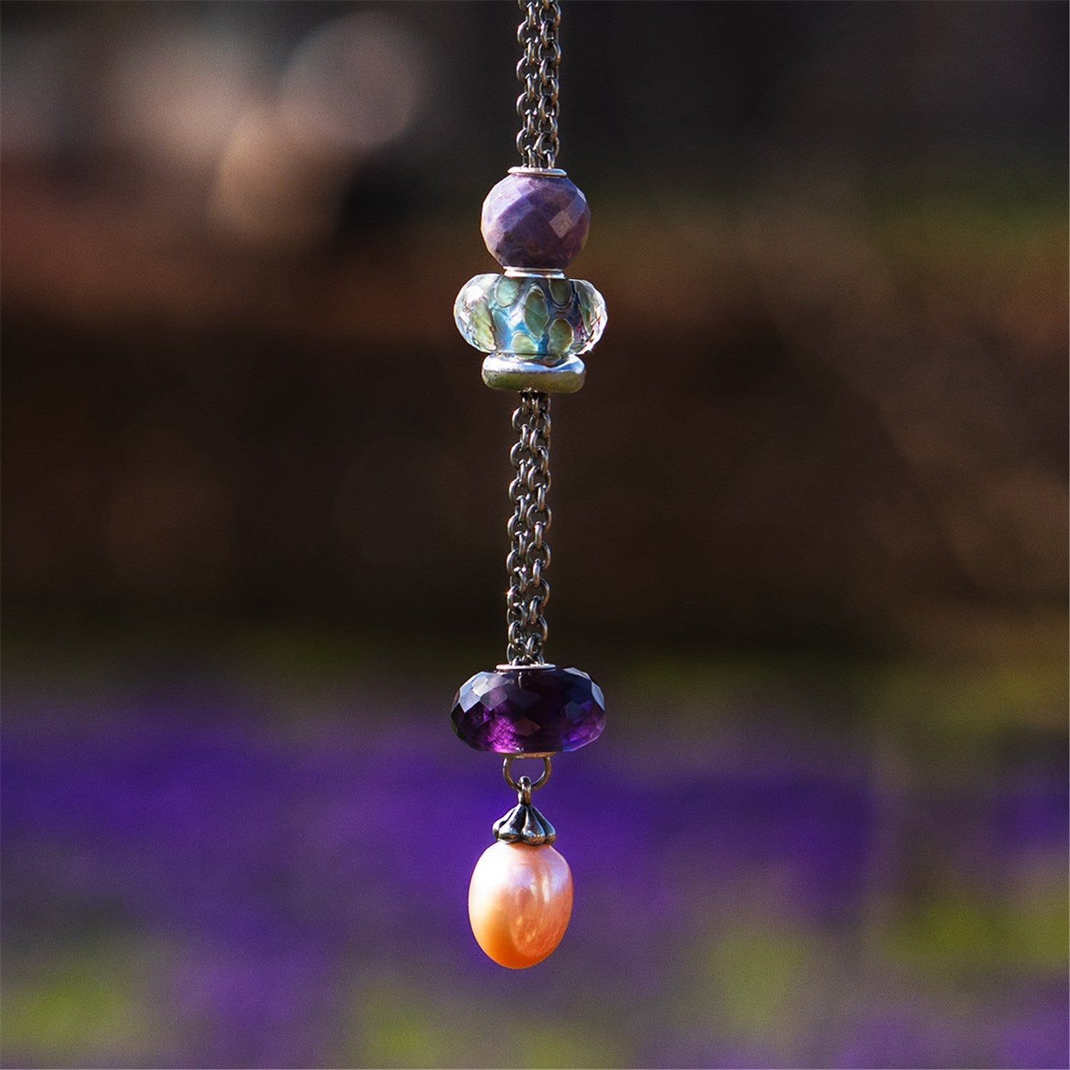 Des tons doux de lavande, de menthe et de bleu pâle se mélangent sous la surface facettée. Chaque perle est fabriquée à la main en verre, créant une profondeur brumeuse qui change doucement avec la lumière.